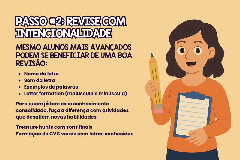 Mesmo que o aluno já saiba todas as letras e sons, uma revisão nunca é perda de tempo. Ela reforça o que foi aprendido e traz segurança para avançar.